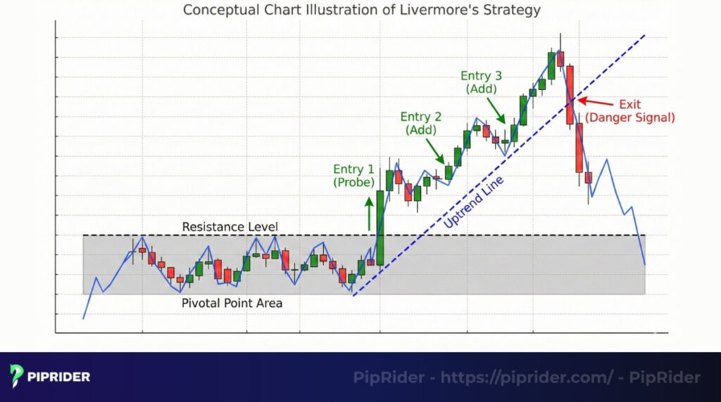 Patience is the key. Livermore waited for a specific market structure he called a “Pivotal Point”—typically a consolidation period where price moves sideways after a trend.