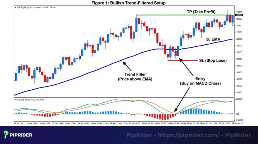 Figure 1: Bullish Trend-Filtered Setup. The price is trading above the rising 50 EMA, confirming the uptrend. A buy entry is taken immediately after the MACD line crosses above the signal line. The stop loss is placed safely below the recent swing low to invalidate the setup if the trend fails.