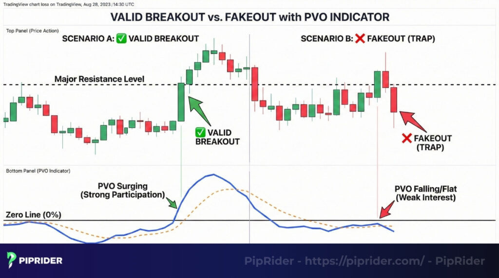 This is the most powerful application of the PVO. Breakouts often fail because they lack genuine market interest. By using the PVO, traders can filter out “traps” and focus only on moves backed by strong participation.
