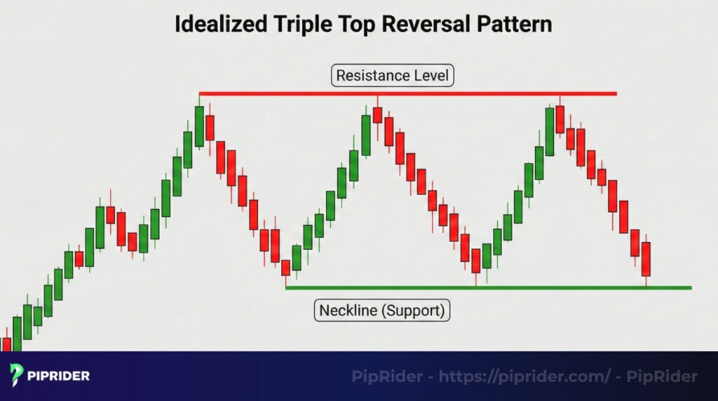 The Triple Top is a classic major bearish reversal pattern in technical analysis (StockCharts, n.d.). While highly recognizable, its real-world reliability depends heavily on strict confirmation—specifically a decisive neckline close, broader market context, and volume validation.