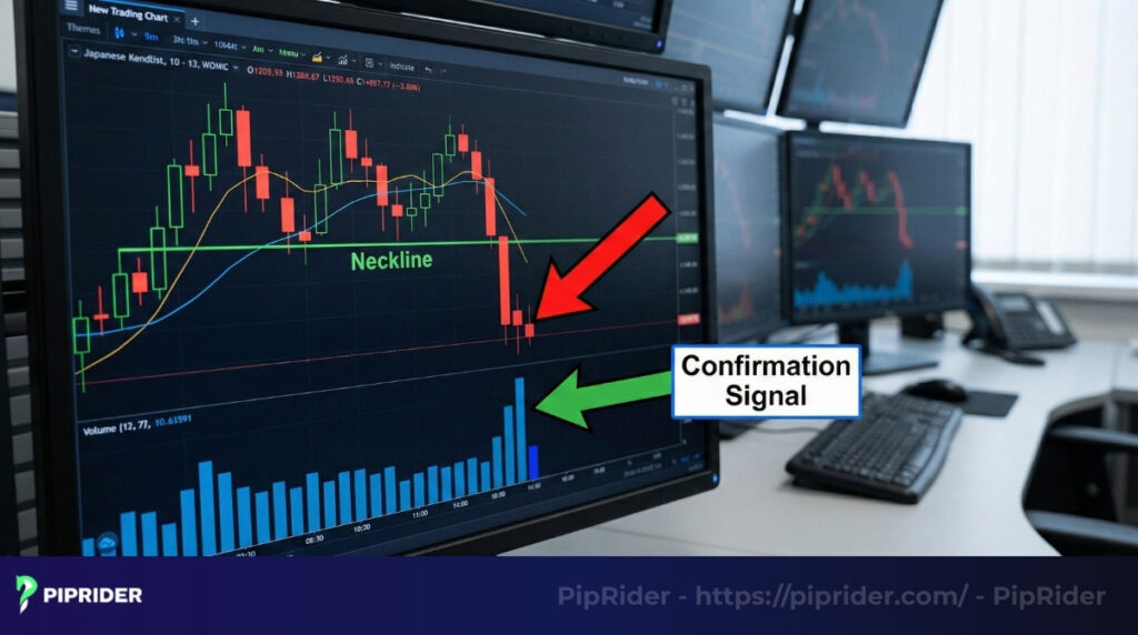 The pattern is confirmed only when the price decisively breaks and closes below the neckline. This breakout should ideally be accompanied by a significant increase in trading volume, signaling strong selling pressure.