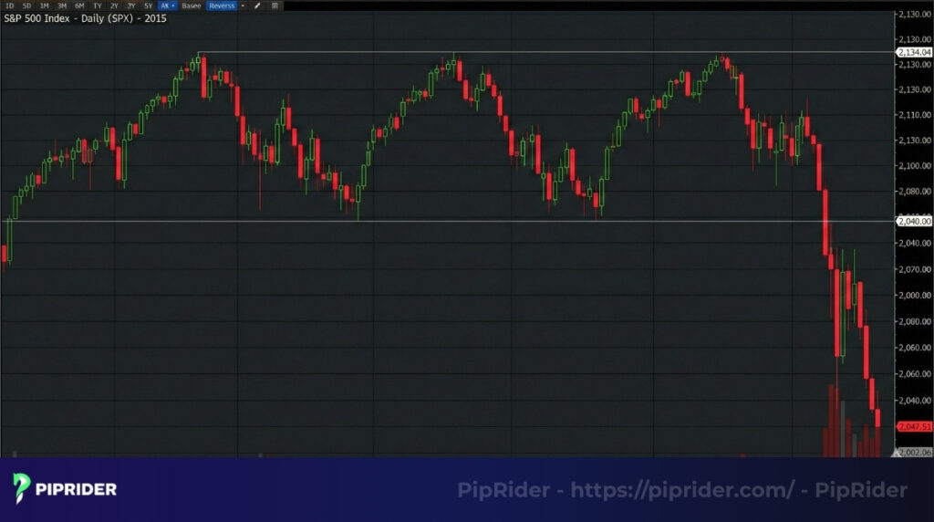 - The Breakdown: When the index finally broke below the 2,040 support level in late August 2015, panic selling ensued, accompanied by a massive volume spike.