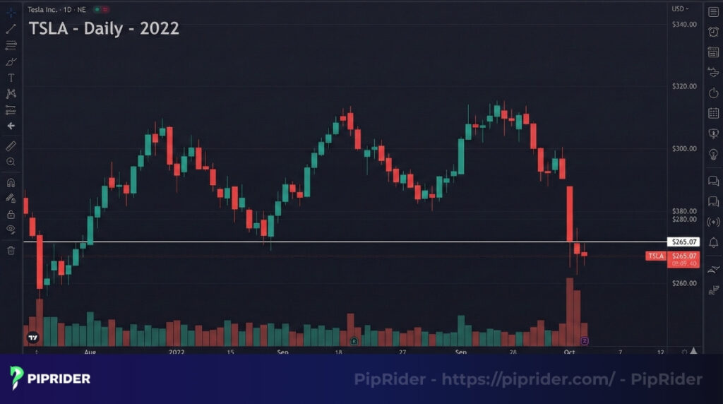 - The Breakdown: In late September, TSLA’s price decisively broke and closed below the $265 neckline with a noticeable increase in selling volume.