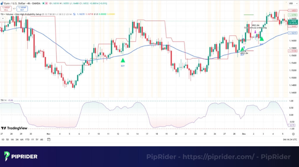 The entry is not taken on the divergence alone. Instead, the trader waits for the price to break above a short-term resistance level. The final confirmation is that this breakout occurs on higher-than-average volume (ideally confirmed by the best volume indicator for forex trading). At the same time, the TSI crosses above its signal line.