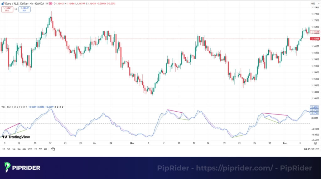 - Positive Divergence: The price makes a lower low, but the TSI makes a higher low. This warns that selling momentum is fading.
